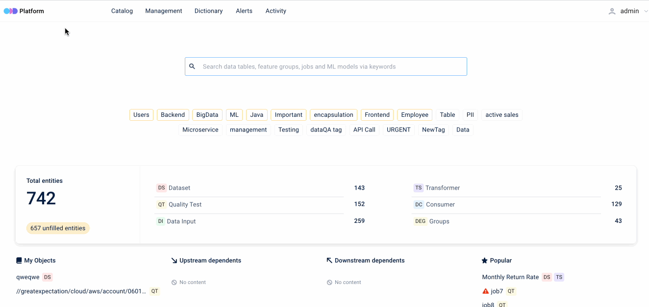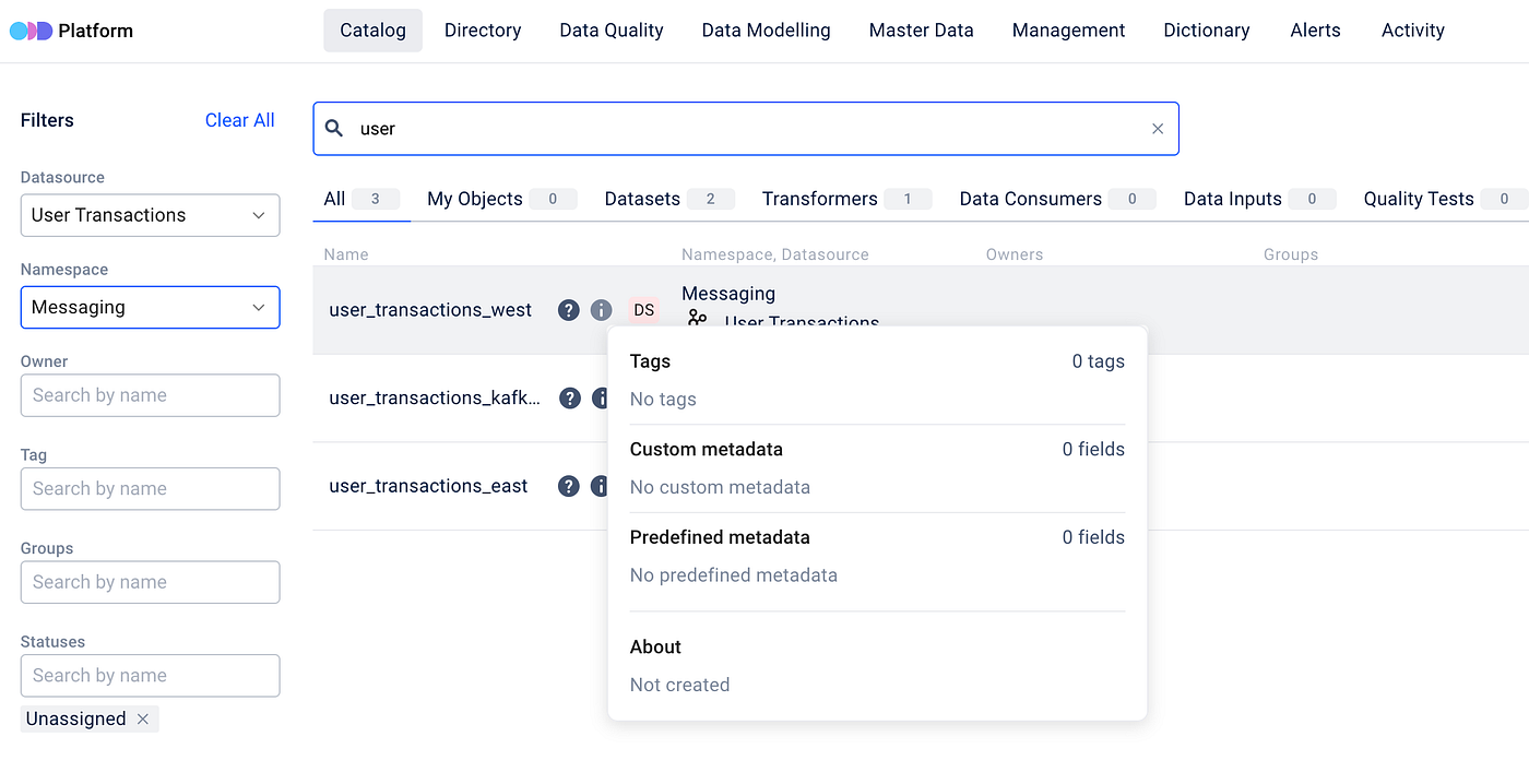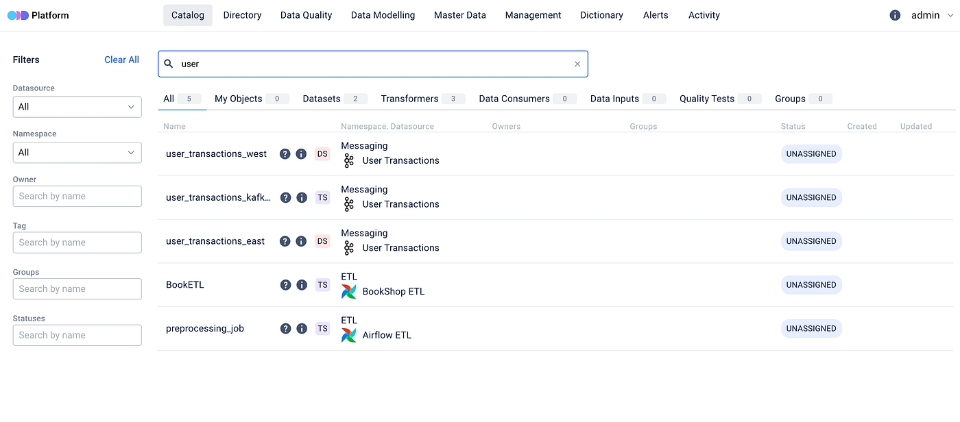 To get started simply navigate to the main page of ODD Platform and select the Catalog tab. There you’ll find the Search bar and Filter options.