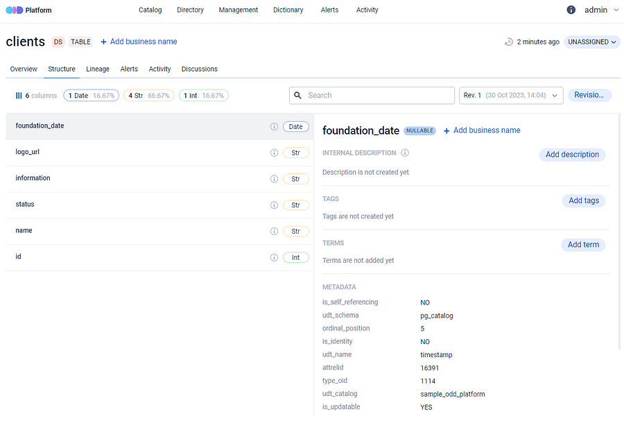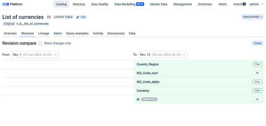 This means that at any given moment, you can review dataset column changes, data type changes for any dataset, and you can also identify differences between any two versions (revisions) of the dataset’s structure.