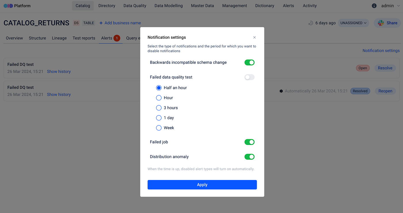Alert notifications within Open Data Discovery are customizable. Users can choose the type and period to receive alert notifications with ease. This setup requires hitting the Notification Settings button and configuring it.