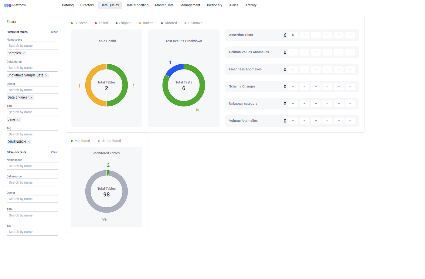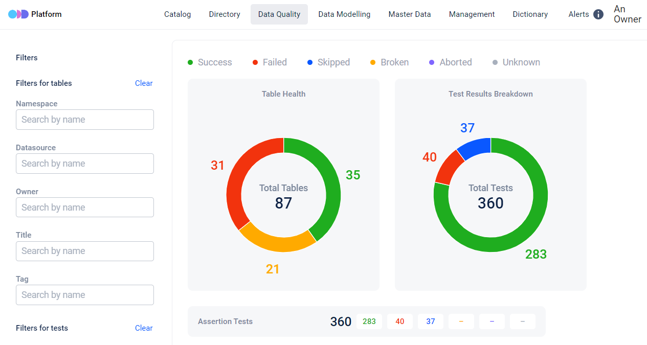 Manage your metadata by tagging tables, datasets and quality tests. Tags provide easy filtering and searching.