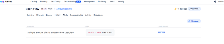 Give an extra information about your data entities by creating terms that define these entities or processes related to them. You may see all terms connected to a data entity on its overview page. All created terms are gathered in the Dictionary tab.