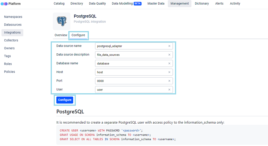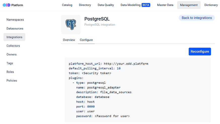Users can generate a piece of configuration file using this tool, then simply copy and paste it into the ODD Collector configuration file. For example, setting up a collector for PostgreSQL is as much easy as simply clicking on the corresponding wizard and by that gaining access to general information outlining the necessary actions and steps.