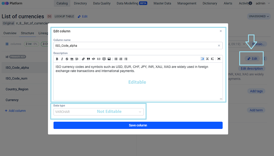 It is possible to further edit, i.e. to rename column or edit the description for that column, or delete columns:
