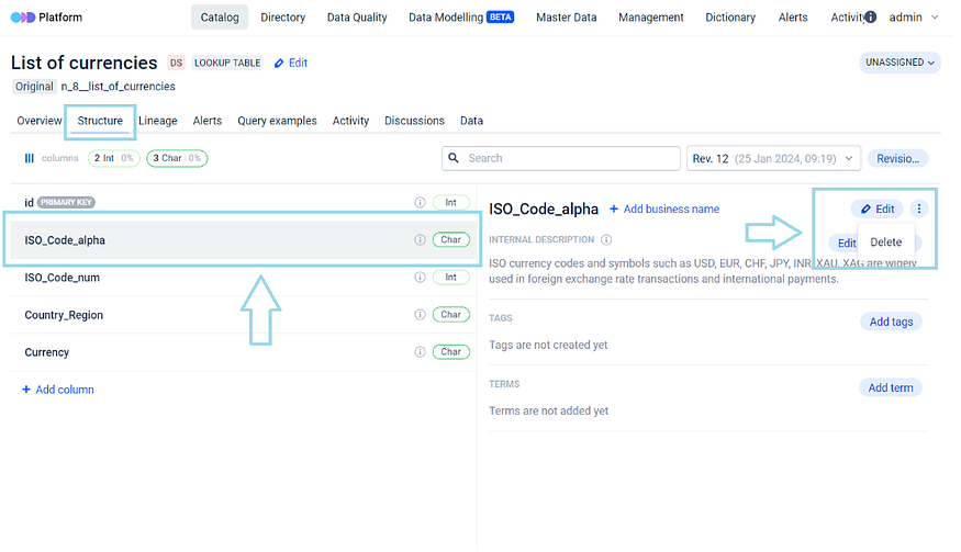 All the actions possible with the structure in any other data entity, such as adding Descriptions, Tags, Terms and Business Names can be performed both with Lookup Table itself and its columns also.